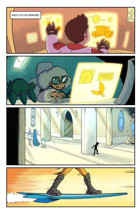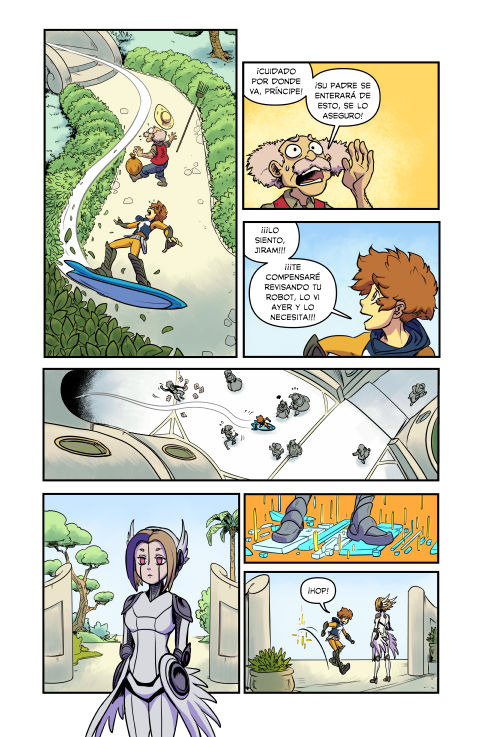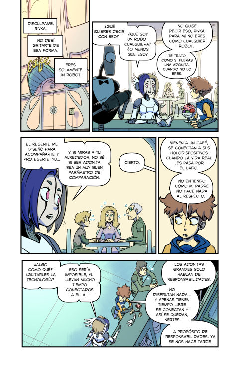Yu wants to be a normal Adonita to play holo-battles, explore the city and above all make friends because he only counts with his guardian robot, Rivka. There is one small detail to acomplish his wishes: Yu is the Prince of the Central Planet Adon and his parents Aram and Lena are the Regents of the system, guided by the strict Blue Sun rules. Because of this, he can’t go outside of the palace, to visit the Stelar Ships or meet other Adonitas. However, everything change when the farest stelar ships begin a rebelion for their independence.